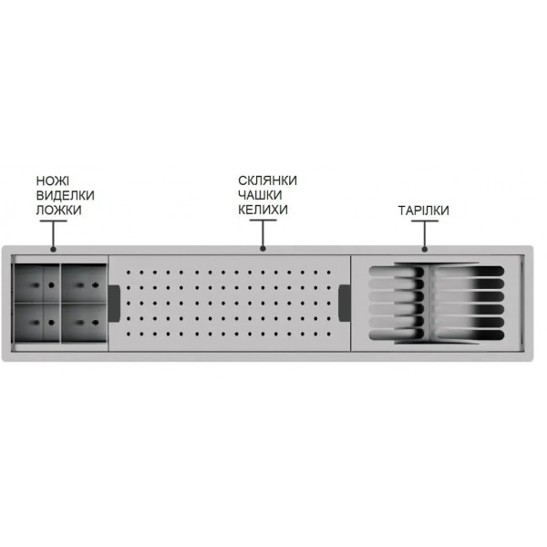 • Конструкція: 3 модулі (для столових приборів, чашок і тарілок)