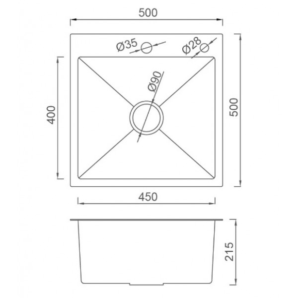 Загальний розмір мийки 500×500 мм дозволяє ефективно використовувати простір стільниці, а чаша 450×400 мм з глибиною 215 мм забезпечує достатньо місця для миття посуду, овочів та кухонного приладдя.