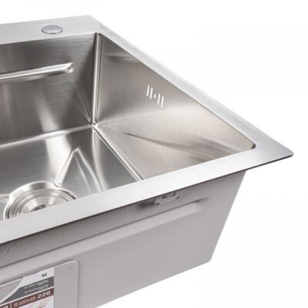 Загальний розмір мийки 640×500 мм дозволяє комфортно організувати робочу зону. Простора чаша 590×400 мм з глибиною 220 мм підходить для миття великого посуду, каструль, сковорідок та кухонного приладдя.