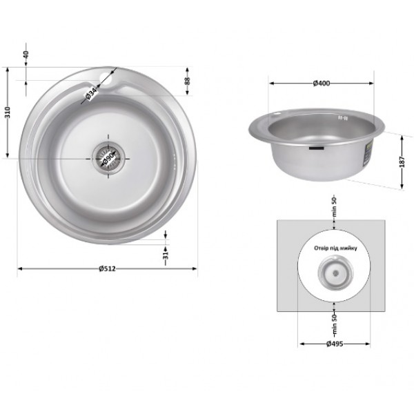 Глибина чаші 187 мм забезпечує комфорт при митті посуду, а нержавіюча сталь товщиною 0,8 мм витримує щоденні навантаження.